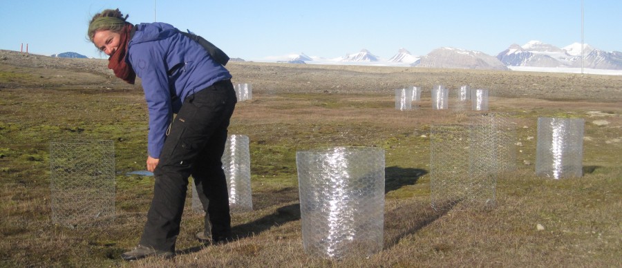 | Dagmar Egelkraut has joined the team as part of her master degree in biology. She studies potential mismatch in the quality of grass in relation to the timing of the breeding season of barnacle geese under global warming. She has placed 72 exclosures on the tundra, half of which are a warmed treatment because they are covered with foil. We study food quality and expect lower quality in warmed plots. Half of the plots will be clipped and compared with the other unclipped plots. Finally geese will be allowed to graze the plots and we will study their preference. | |