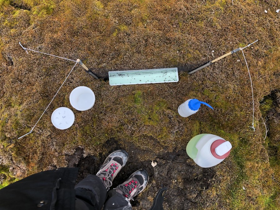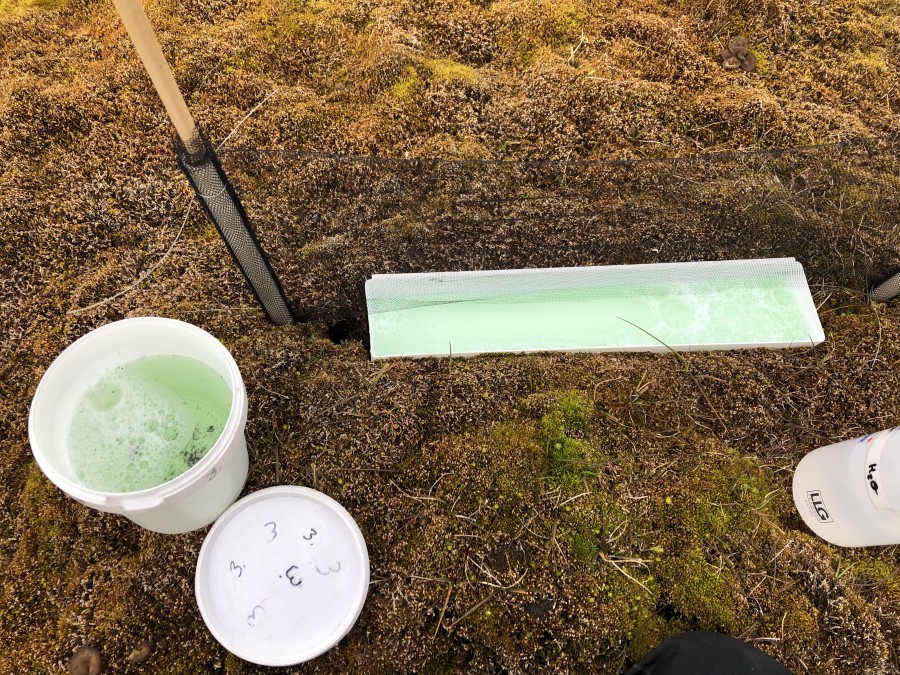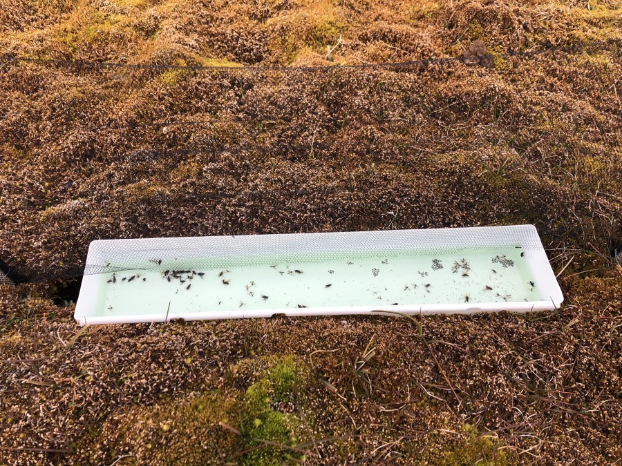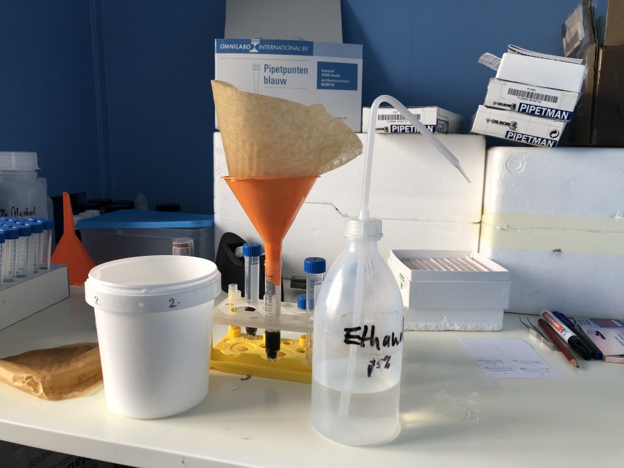 | We verzamelen al sinds 2006 iedere twee dagen insecten die in onze eenvoudige vallen zijn gevallen: bakjes met zeepwater met daarboven een netje. De insecten worden gefilterd in een koffiefilter en daarna overgebracht in 15 ml buizen met ethanol. Tessa heeft de hele gang van zaken gefotografeerd en leegt om de dag de vallen. | |
