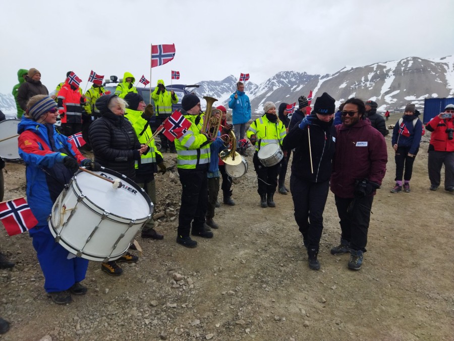Gregory Tan is twee rondes stationsleider geweest van AWIPEV. Altijd vriendelijk en behulpzaam heeft hij veel vrienden gemaakt. Met zijn bijzondere foto's is veel van de omgeving vastgelegd. Vandaag vertrekt hij met een luxe toeristenboot naar Lonbgyearbye. Het dorp is uitgelopen om hem vaarwel te zeggen en een serenade te brengen met de lokale band Musik og Schlag. |