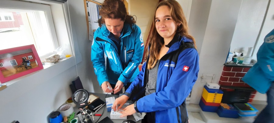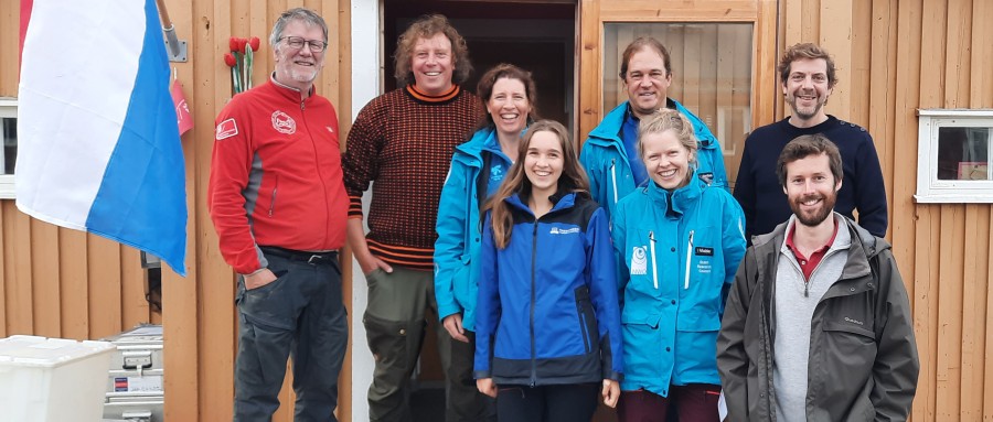 | Vandaag kamen we met 6 mensen terug van de succesvolle sees.nl expeditie naar Egeøya. Van links naar rechts op de achtergrond: Maarten Loonen, Christophe Brochard, Martine van den Heuvel, Hans Verdaat en Ramsey Nasr. Op de voorgrond: Nanne van den Heuvel, Ingeborg Mulder and Quentin Mauvisseau. Quentin kwam met het team van Martine maar was niet mee met de expeditie. | |