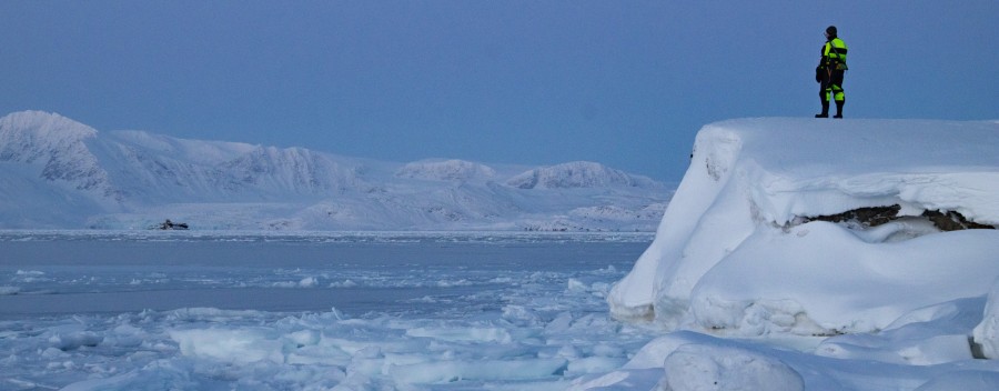 Dit jaar is er erg veel ice in het fjord. Fieke Rader, stationsleider van AWIPEV is over het ijs naar Prins Heinrichsøya kunnen gaan. Het ijs was dik genoeg. Let ook eens op het zonlicht wat aan het terugkeren is midden overdag.
