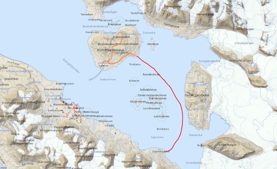 Maar als ik een lezing geef over klimaatverandering gebruik ik vaak de hoeveelheid ijs in het fjord als een duidelijk teken van klimaatverandering. De bewoners van het dorp konden zowat ieder jaar over het ijs rechtstreeks van Ny-Ålesund naar Ny-London lopen, hebben de oud-mijnwerkers mij verteld. Het was daarom erg opvallend nieuws, dat dat in 2007 niet mogelijk was en nog bijzonderder dat het sindsdien nooit meer is voorgekomen. Maar op de NYSMAC vergadering in Edinburgh hoor ik ineens dat het in 2024 wel mogelijk is geweest. Daar moest ik meer van weten en ik vroeg aan Fieke meer details. Vegård Sand heeft een kaartje vanb hun tocht gemaakt en wat blijkt..... ze namen een route die behoorlijk diep in het fjord lag en achter de eilanden langs liep. Gelukkig. Mijn verhaal is nog steeds waar en ik ben blij dat ik gevraagd heb om de route van de oversteek. Er is ieder jaar nog steeds veel ijs achter in het fjord. Maar een rechtstreekse oversteek is nog steeds niet mogelijk geweest. Oef. | |