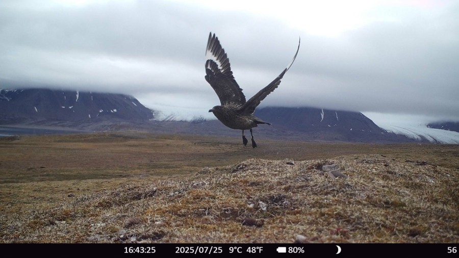 | De grote jager leeft van andere vogels. Op het eiland Storholmen komen we allerlei karkassen tegen van eidereenden en ganzen. Ik heb ze wel eens zien jagen op een volwassen ruiende brandgans. Om dat te kunnen werken beide partners nauw samen. Eerst wordt een slachtoffer geisoleerd van de groep en daarna landen de vogels om de beurt op de rug van de gans, die daardoor verdrinkt. Een ganzenkuiken is een gemakkelijk prooi, maar de ouders verdedigen het kuiken succesvol. En opeens verschijnt er een jong van de grote jager voor de camera. Ook het jong is al geringd met een gele kleurring met inscripie JZ. |
