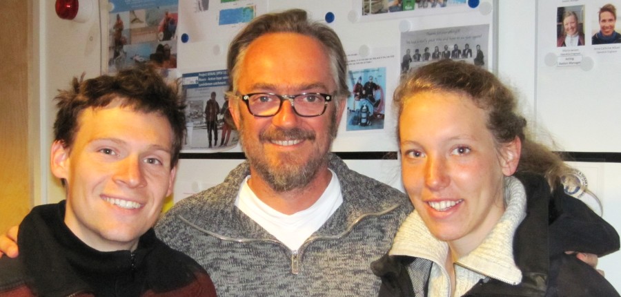 | It is always strange when people leave in the middle of the season. Today 3 people disappear from London IV. From left to right Ross Wetherbee, Nico van den Brink and Malenthe Teunis. Ross will move to UNIS in Longyearbyen to extract fleas from the last samples. Nico will return to Wageningen University. His blog can be found here. Malenthe will join the tourist boat Quest for becoming a tourist guide on board and than meet her parents and boyfriend for a short holiday in Longyearbyen. | |