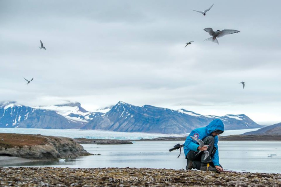 | We have been catching arctic terns on an island. Esther Kokmeijer made this picture of my son Janwillem, replacing the trap after a successfil catch. | |