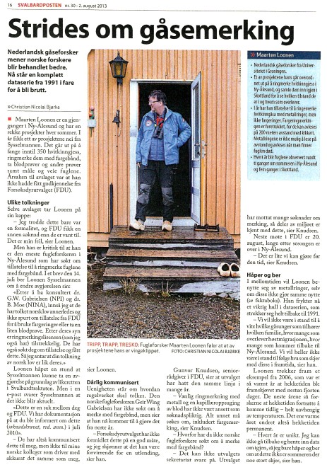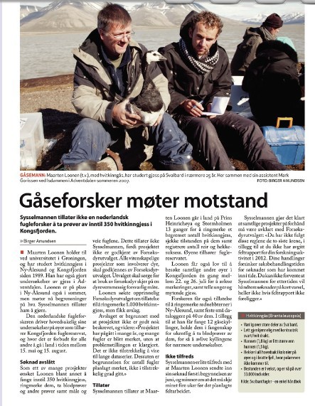 The law has not changed but the interpretation of the law, by the animal experimentation committee has. So they have asked me to send in an application for colour ringing and blood sampling. Than they rejected this application. Their reasoning: NARA finds that the hypothesis and obtained results are not sufficiently described. The project has been going on for many years, many birds have been marked, and from the application the remaining questions to be answered are not clear. It is not sufficient to refer to long data series. Also, the justification for the number of birds planned to be used, is not sufficiently provided. Finally, the procedures are not sufficiently described, including handling time of the birds and how the procedures have been refined over the years. In a revised application NARA would like to have information and documentation on whether the use of new technology, ie. loggers, radiotransmitters etc. can be applied and how the use of such technology may reduce the number birds needed to answer the questions asked. The next NARA meeting will be August 20 2013, and the deadline for sending a (revised) application is July 30 2013. Pleas note that according to the regulation on animal experimentation, it is not possible for NARA to approve on any field experiment for more than two years at a time. Also, NARA requests to have a report on what has been the result so far after so many years of marking birds and which information is still lacking from a scientific and/or management related perspective This report should be send to NARA within July 30 2013. Next meeting of NARA is after the field season. So I will miss an annual datapoint in a continuous time series since 1991. We have about ten different studies based on this sampling, but how to describe bird ringing in general which would be appropriate to the comments of NARA. At first I just accepted, but than I found out that I am the only one of the local ornithologists who has asked permission and who has been instructed to ask permission. All my Norwegian colleagues have interpreted the situation differently. Even Geir Wing Gabrielsen who has been several years member of NARA. There is a lot of colour marking and also blood sampling by Norwegians. I seem to be the first who is entangled in this adminstrative web. Stavanger Museum is convinced that a ringing license (which I have) is enough for colour marking and taking a small blood sample. So I have asked Sysselmannen if this is not a violation of the Salbard Treaty. They simply stated in their answer that it is something between NARA and me. They have correspondence that I should know that permission was needed from 2010 and that they will not approve unless NARA has approved. So I have now permission from the Governor to ring 350 barnacle geese with metal rings only. Everybody is on holiday and nothing can be done. The local newspaper follows all correspondence with Sysselmannen (which is always public). So far, they have written two articles about this issue, simply stating the situation. This autumn, I will seek further clarification. | ||