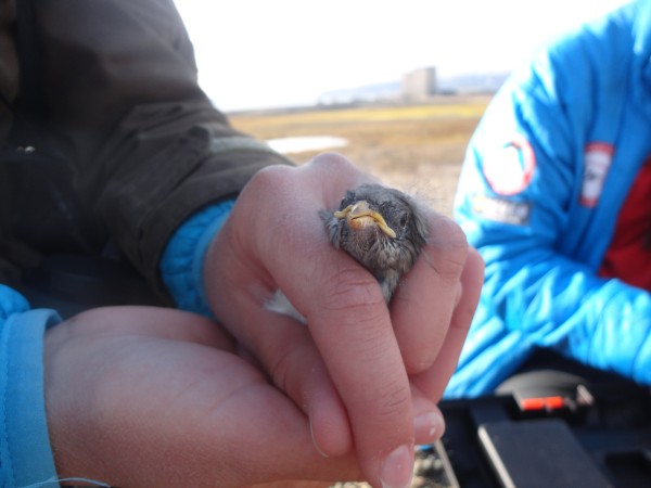 | Today we are ringing 17 snowbunting chicks with metal and colour rings to study toundra survival. Soon they will leave the nestbox and follow their parents begging loudly. In this period many will be taken by the Arctic fox. | ||||