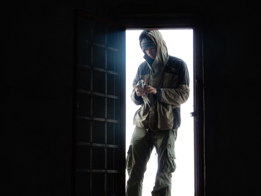 | Today we are catching a tern with geolocator on the roof of Renseverket. Renseverket is the tallest building in town with a concrete roof, covered with decaying wood panelling. It is a dark industrial monument, with a somewhat creapy atmosphere. But it is also one of the two safe places in town for arctic terns to nest. We have tried to catch this logger bird yeaterday, but it escaped from the trap when the netting got stuck behind a nail. Today with another model trap we manage relatively fast. On the way in I made a picture of Janwillem, which catches the atmosphere of the building too. | |