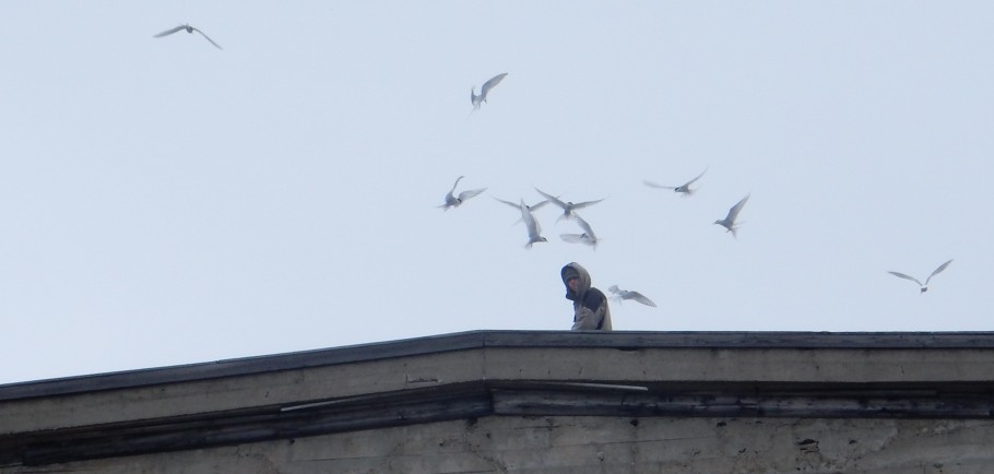 | De sternen op het dak worden gecontroleerd door Janwillem. Geen predatie maar nieruwe gevaren op deze plek. Met harde wind is er al eens een jonge stern van het dak gewaaid. | |
