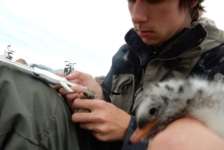De enige twee jonge sternen bij de hondenhokken worden geringd. Zelfde nest, maar verschillende kleur kuikens. |