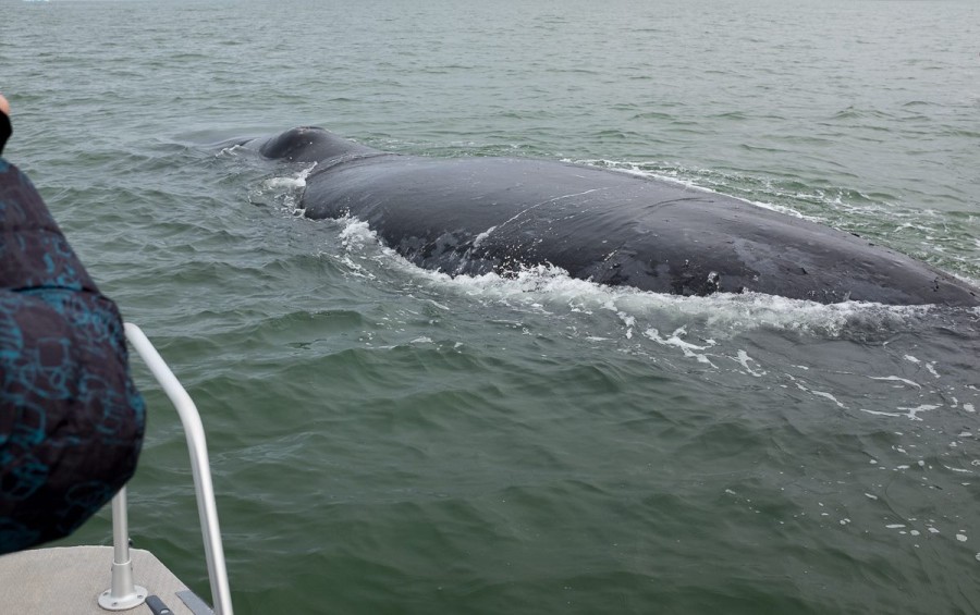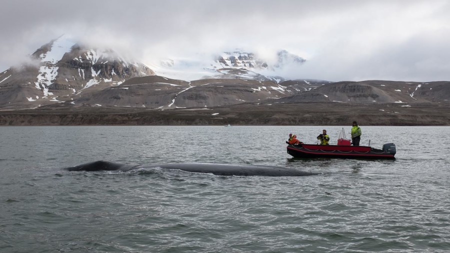 Below two videos in which you can see even better that it is a bowhead whale. Also you can see the slow movements of this whale which made it easily catchable. In the first video you can see the town of Ny-Ålesund in the background. In the second video you can see a characteristic blow. | |