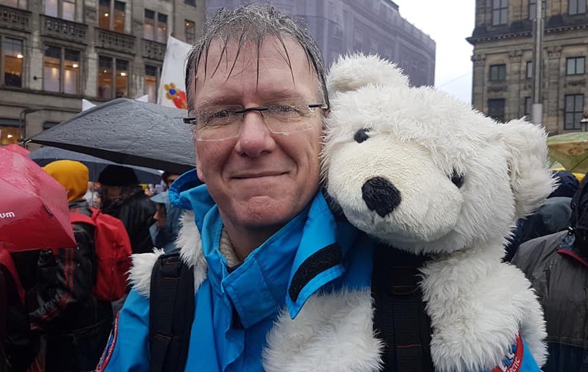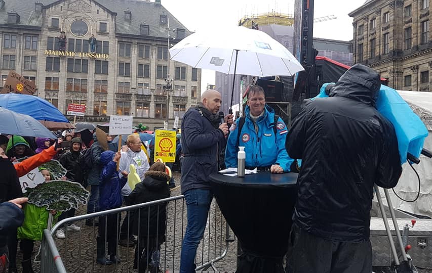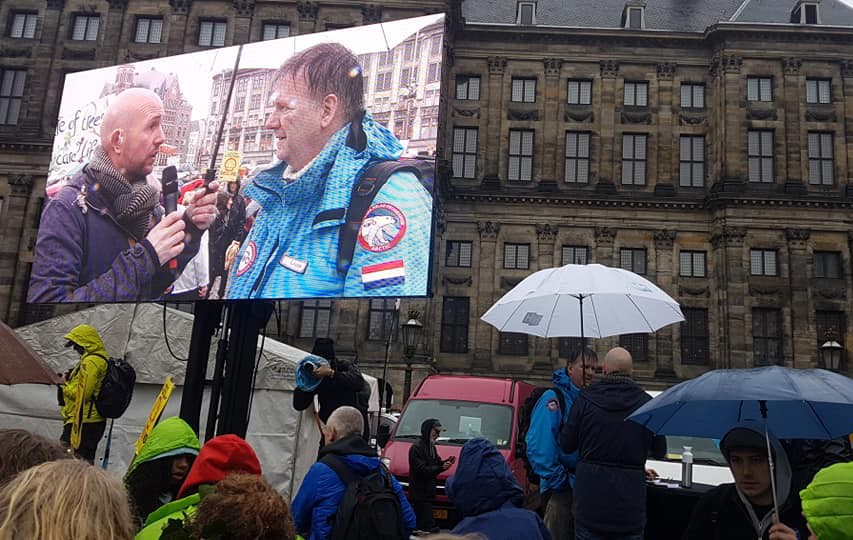 | On 10 March 2019, a special march was organised in Amsterdam to motivate the government for further action against climate change. 40.000 people marched in heavy all day rain. Just before the start of the demonstration I was interviewed for the online broadcast on klimaatmarslive.nl. The stream was also on screen just before the start of the official programme. | |||