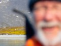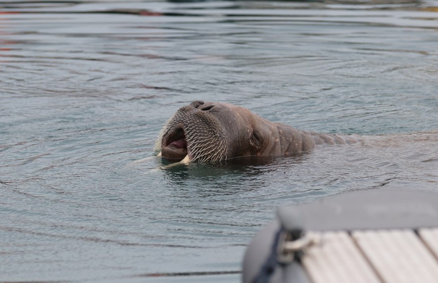 We komen maar heel weinig keer een walrus tegen in het fjord. Maar vandaag gebeurde het. Kristle was de rubberboot aan het bijpompen. Ze probeerde nog de laatste paar slagen met de pomp toen het ineens vlakbij hard ging blazen. Eerste gedachte was dat de boot gescheurd was. Maar het bleek een walrus die in het lege aanlegvak naast onze boot boven water kwam. Marije was snel genoeg om een foto te maken. Je ziet op de foto nog de vier meter lange instapdrijver naast onze boot. De walrus ging weer onder en kwam nog slechts enkele keren boven water terwijl de weg naar het oosten werd vervolgd. | |