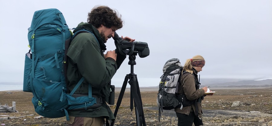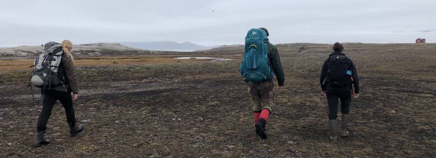 | Time for a nice walk to the hut Gåsebu, 4 kilometers out of the village. Margje, Tessa, Catharina and Rienk will spend the night in this hut. It is a real Norwegian tradition to do this. On their way to Gåsebu they have to read rings of barnacle geese. Only two geese found. | |