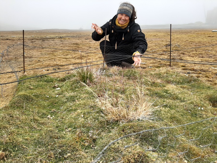 | Catharina Uth houdt van planten. Nu ze klaar is met haar mesocosm experiment wil ze graag meehelpen met de vegetatie studies. We meten grasgroei terwijl Margje en Isabella over onze hoofden ringen van ganzen lezen. Daarna beschrijven we de vegetatieveranderingen in de exclosures waar ik sinds 2006 de ganzenbegrazing buitensluit. Om daar te komen moeten we langs enkele agressieve noordse sternen. Ze bombarderen catharina en daarmee heb ik weer een mooi vers poepmonster. | |
