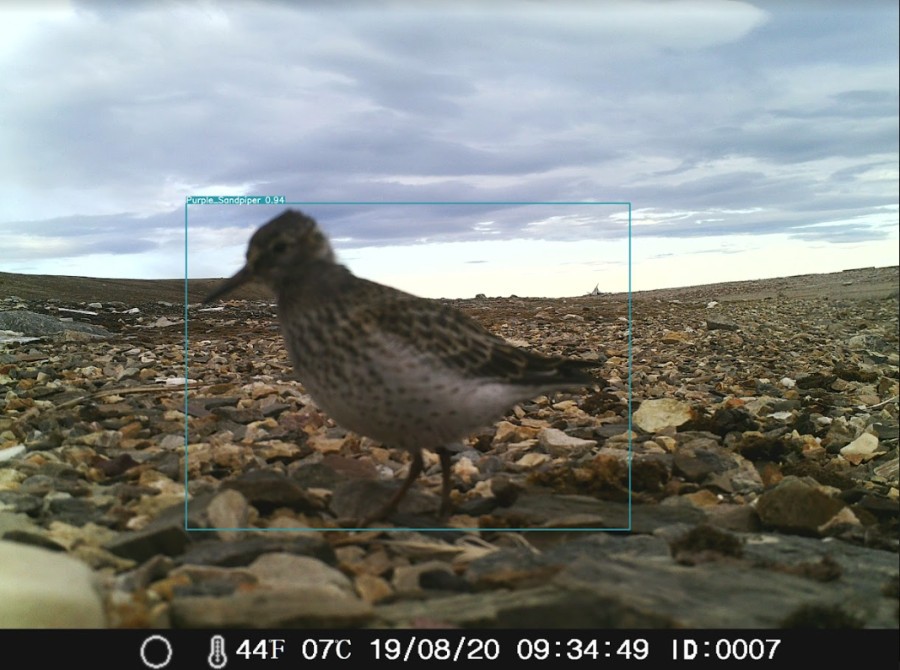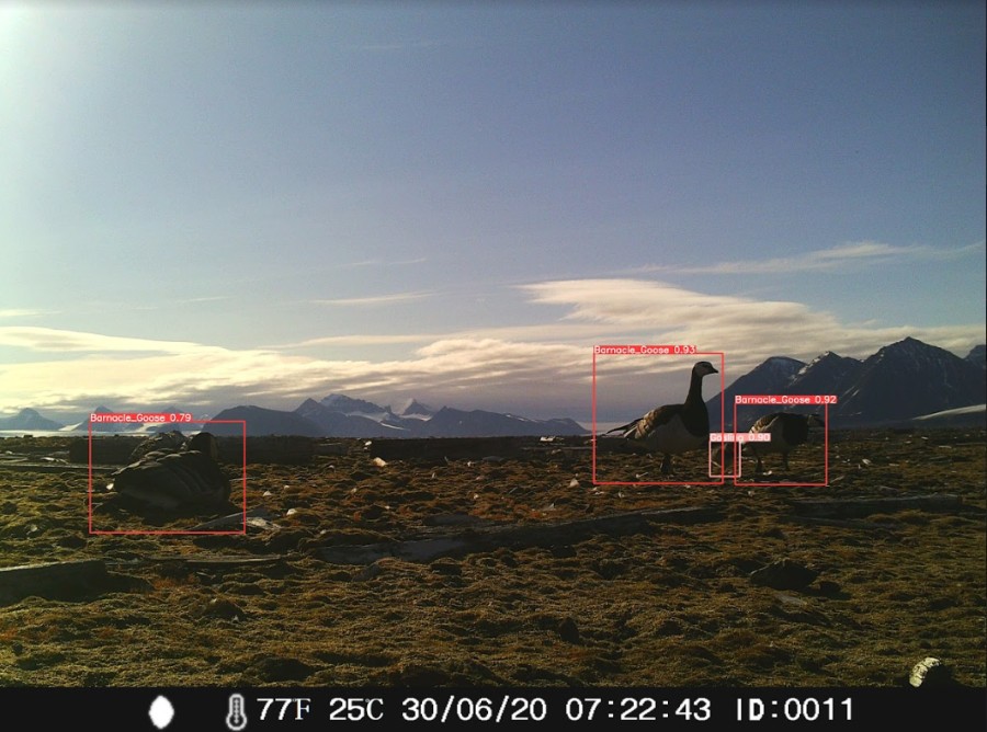 ![]() After giving the programme a learning set, it finds the animal and even gives an accuracy of the determination. On this picture there are three adult barnacle geese and also one goslings identified, despite the difficult light conditions. On the picture below it is a purple sandpiper passing the camera. | |