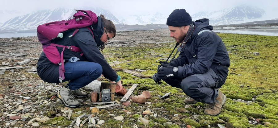 | We hebben gisteren een veiligheidstraining gevolgd en zijn daarna naar de schietbaan geweeest. We zijn allemaal geslaagd. Vandaag gaan we het veld in om 8 cameras te hangen boven vegetatieplots om de ontwikkeling en bestuiving van Dryas te volgen (zie hier). Daarna plaatsten we 4 cameras op de bruggen over de rode rivier waar we de poolvos goed kunnen volgen (zie hier) en 6 cameras rond Brandalpynkten op vaste plaatsen waar we de dieren daar in beeld vangen. De foto hieronder is op Brandalpynkten. Zo krijgt Anne heel wat fotos om te analyseren, maar dat gaat tegenwoordig snel met haar programmatuur. | |