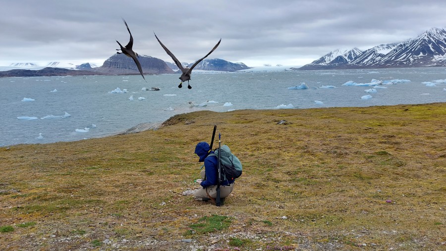 Roos kijkt of een nest van een brandgans op uitkomen staat. Het nest is niet ver van een nest van een paar kleine jagers. Ze zijn Roos fel aan het wegjagen. | |