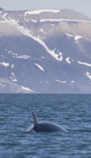 On their way to check hatching eider ducks, Elise and Børge encounter a minke whale close to the boat. You can recognize this species by the black colour and the simultaneous surfacing of the blow hole and the fin on the back. | |