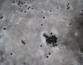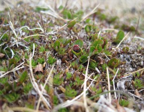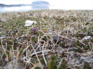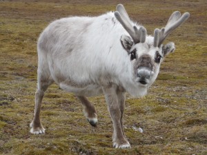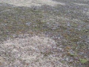 One of the three reindeer which stayed on the island when the fjord ice melted is curious and comes close. The snow is covered with their winter droppings. They are black and wwarm faster from the sun than the sun-reflecting snow. This makes them melt through the snow. Finally a grass area on the tundra with some close-ups of grass and the forest of Spitsbergen: small willow plants. |