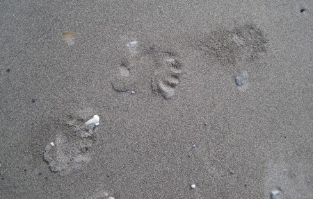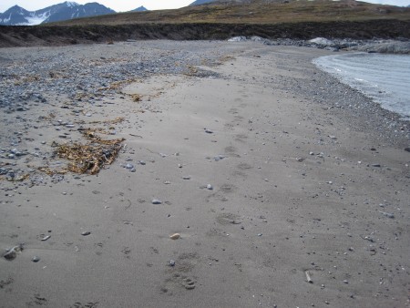 | Vorige week waren er al sporen gemeld van het eiland. Deze sporen zien er wel redelijk maar niet ontzettend vers uit. Alert lopen we naar het hoogste punt van het eiland, maar verwachten toch geen beer omdat geen van de vogels alarmeert. Uiteindelijk blijkt er ook geen beer op het eiland te zitten en tellen we 75 ganzen. | |