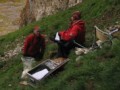 28 juli 2006, 15:00 Vossen merken. De vossenburcht onder de London-hutten is beroemd. De vossen zijn erg fotogeniek en gewend aan mensen. Ze hebben een groot effect op de ganzenpopulatie. Is dat nog wel natuurlijk? Ik denk het wel, want dieren zijn niet bang voor mensen als we ze met rust laten. Daarnaast is het dorp één van de plekken met de meeste grondbroedende vogelsoorten. Een predator hoort daarbij. Gelukkig hebben we samen met de Noren kunnen afspreken, dat we de vossen met rust laten. Er is een strikt beleid op het niet voeren van de vossen.Voor mijn onderzoek is het belangrijk om deze vossen te kunnen herkennen. Ik heb toestemming gekregen om ze te merken. Dat ging beter dan verwacht. In één dag had ik 8 puppies en de moer. Nog één jong en de rekel, maar die laten zich niet meer zien. |