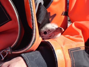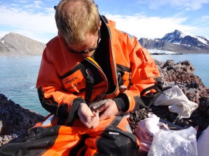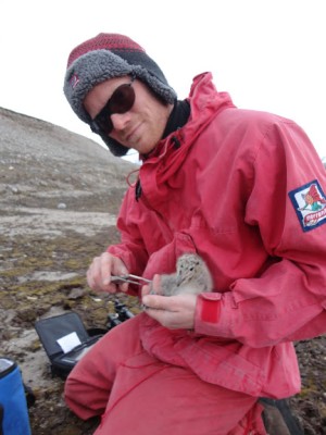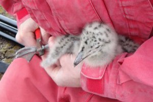 Tore Nordstad needs some help today with ringing of glaucous gull chicks. Suzanne is accopanyiong him and has made these pictures. Tore is ringing, measuring and takes a blood sample. | ![]() |