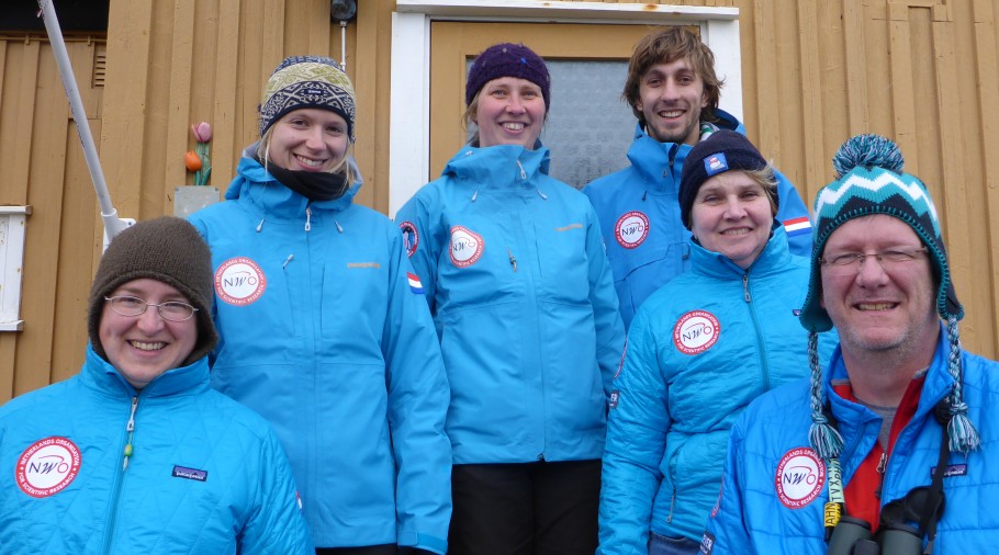 | The team of the Netherlands Arctic Station presents themselves in front of the station with their new jackets from the Netherlands Organisatioon for Scientific Research (NWO) and their new bicycles and some wooden shoes. The pictures are taken by Karoline Baelum for the website of Svalbard Science Forum From left to right Brigitte Weiss, Margje de Jong, Suzanne Lubbe, Tim van Oosten, Isabella Scheiber and Maarten Loonen. |