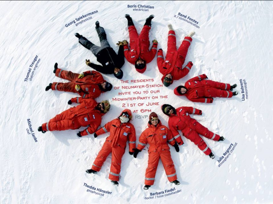 | We are receiving invitations from Antarctica (Neumayer at 70°40.5'S) for their midwinter party. We have to respond quickly with an invitation for our midsummer partty. Rudolf Denkmann takes the lead. |